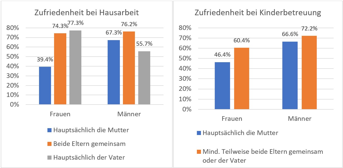 Lesebeispiel: Bei den Frauen sind lediglich knapp 40% «sehr zufrieden» mit der Arbeitsteilung, wenn sie einen Grossteil der Hausarbeit erledigen. Wird die Hausarbeit hingegen geteilt, geben rund drei Viertel der Frauen und Männer an, sehr zufrieden zu sein. Bei der Kinderbetreuung ist der Unterschied weniger ausgeprägt, aber dennoch nicht zu vernachlässigen.