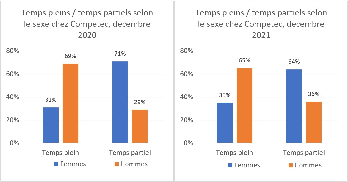 Il ne s’agit aucunement d’un traitement de faveur pour certain·es collègues. Chez Competec, les temps partiels représentent un cinquième des emplois. 64 % de ces temps partiels étaient occupés par des femmes en 2021. Un an plus tôt, ce taux était encore de 71 %.
