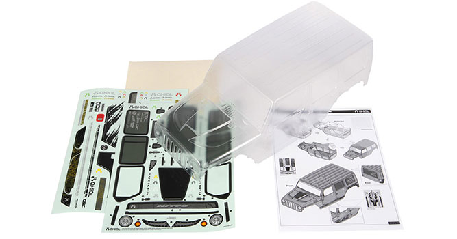 Unlackierte Lexankarosserie eines Jeep Wrangler mit Aufkleber und Anleitung von Axial.